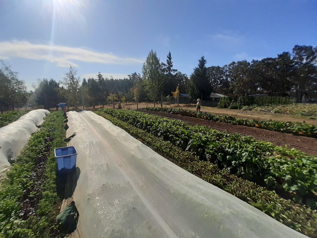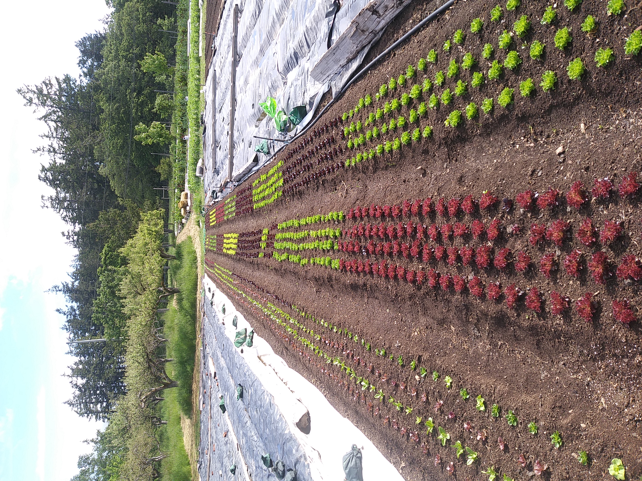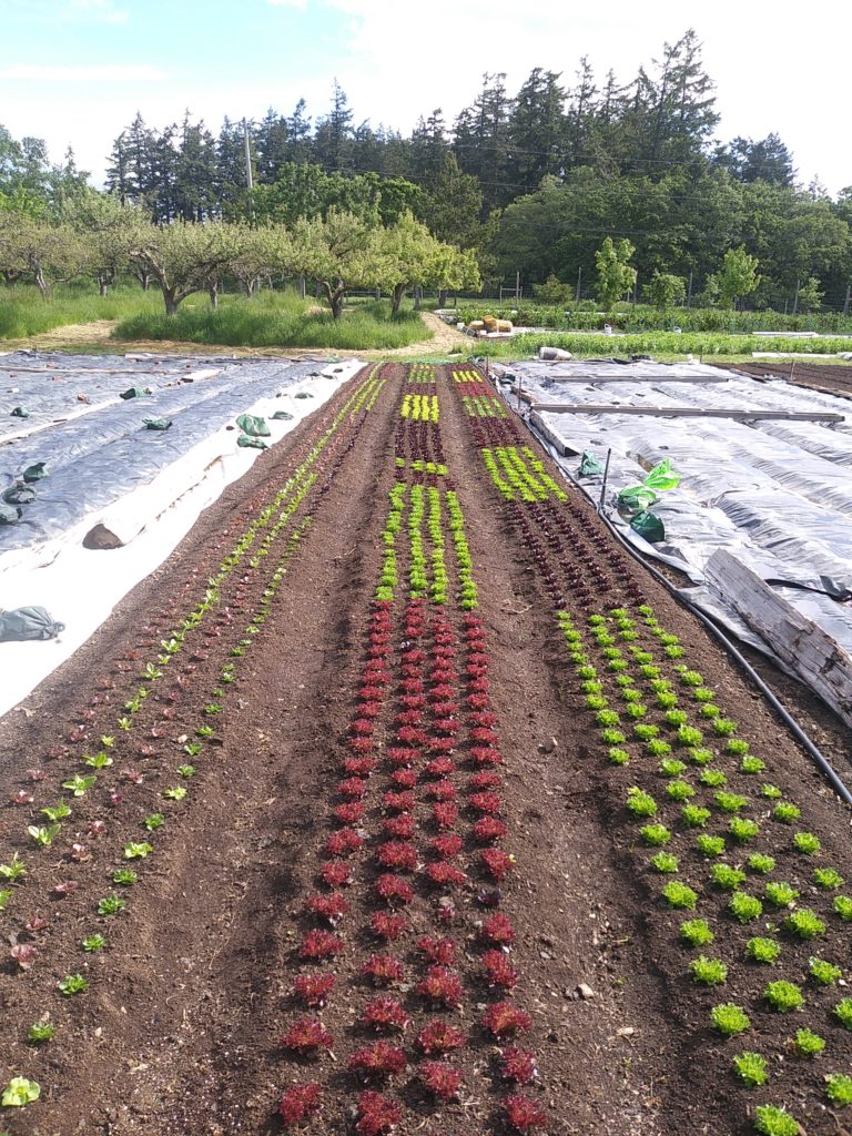 To get an early start in the spring, half of our garden beds are shaped, composted and broadforked in the fall, and covered with a plastic tarp overwinter. We pull back the tarps to seed or transplant as early as march. It will take about 1 month for these beds of transplanted lettuce heads to become salad mix, a much appreciated veggie box staple.