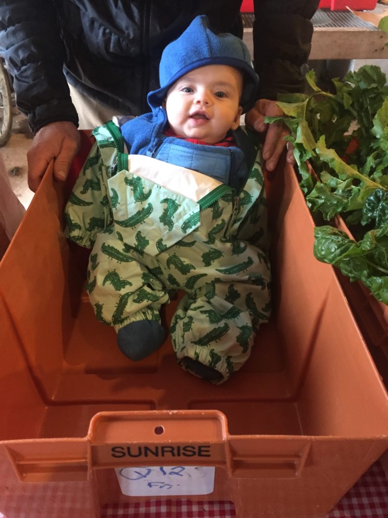 Alex & Virginie’s son, little Yanou, was born in May, less than two weeks before the beginning of the Local Food Box Program. This little spring cabbage came right in time for harvest (best crop ever!).