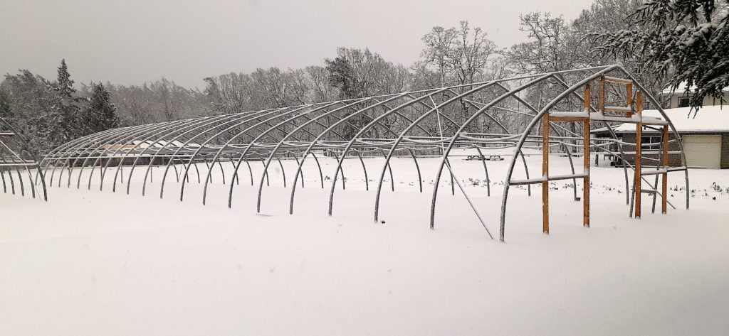 Wind Whipped Farm greenhouse frame in snow, one of several building delays…