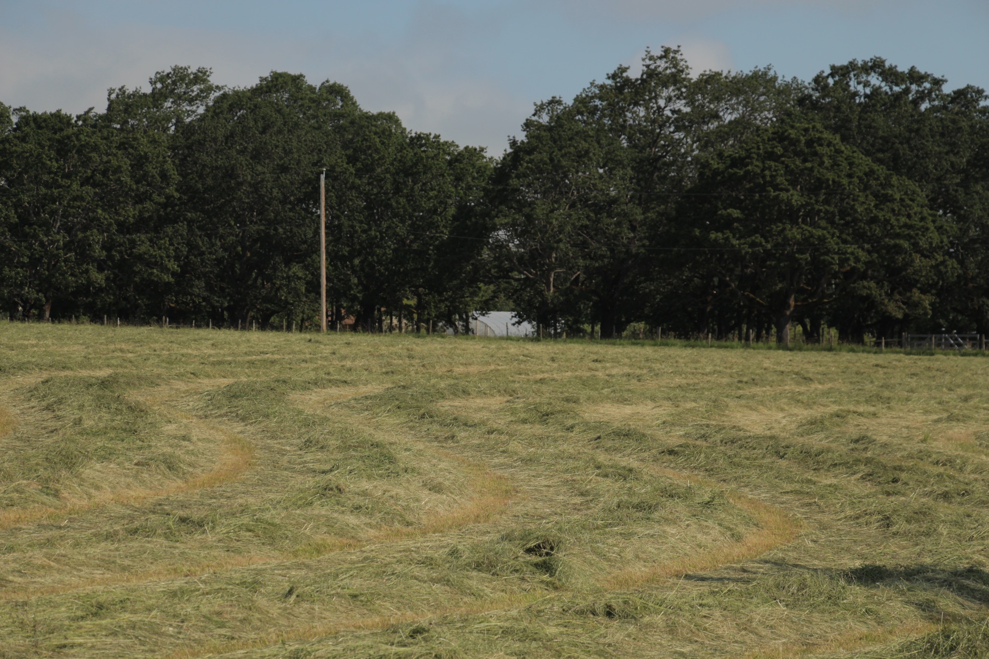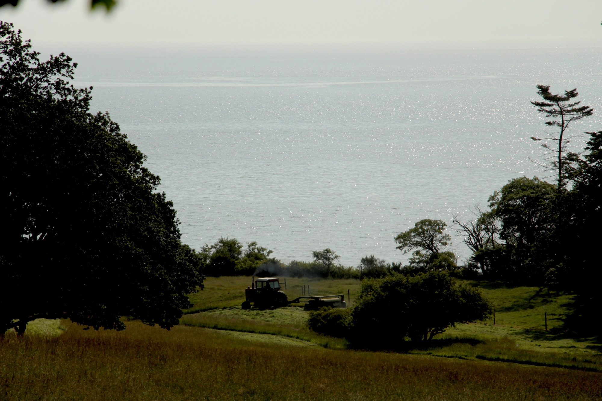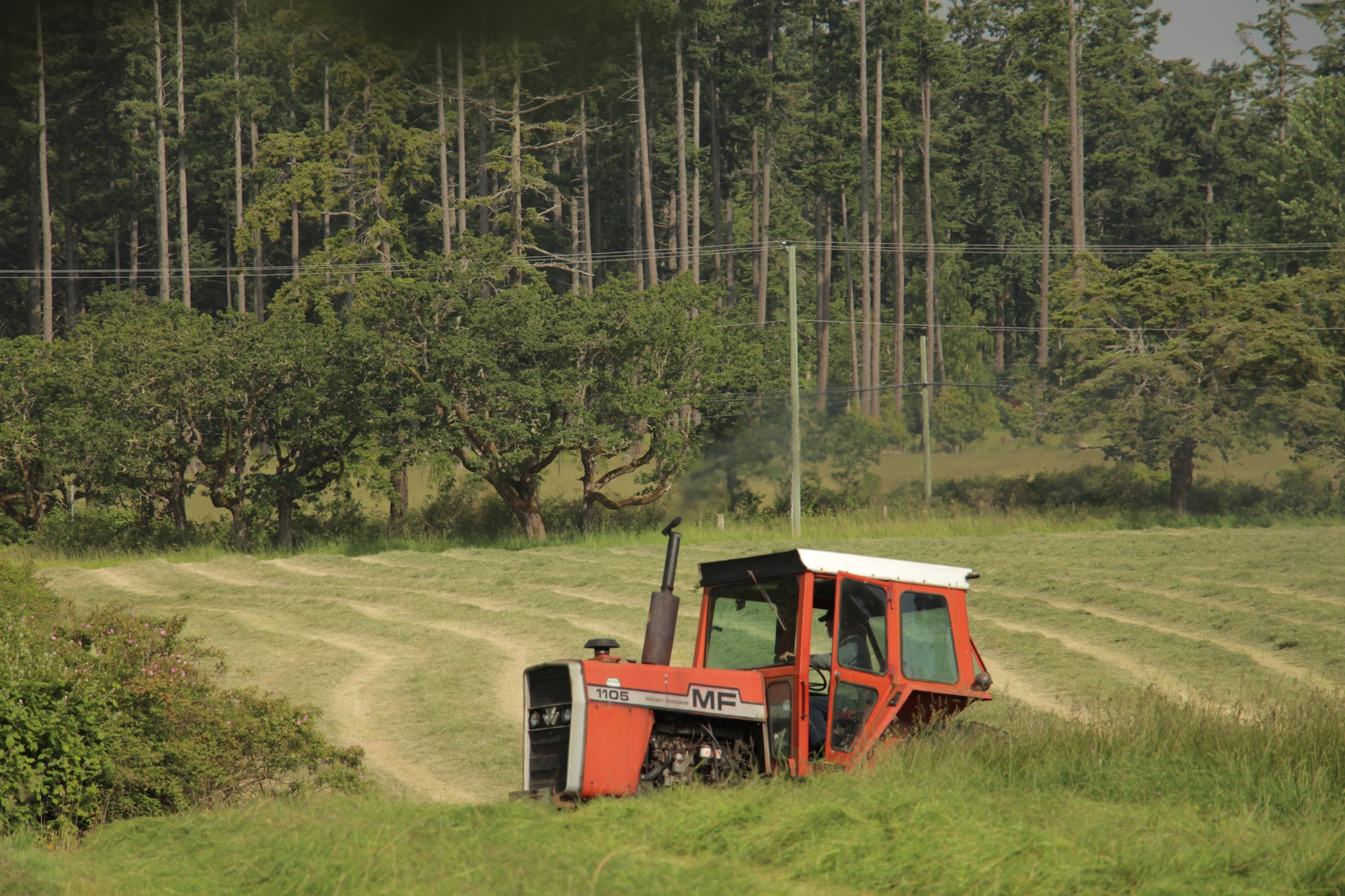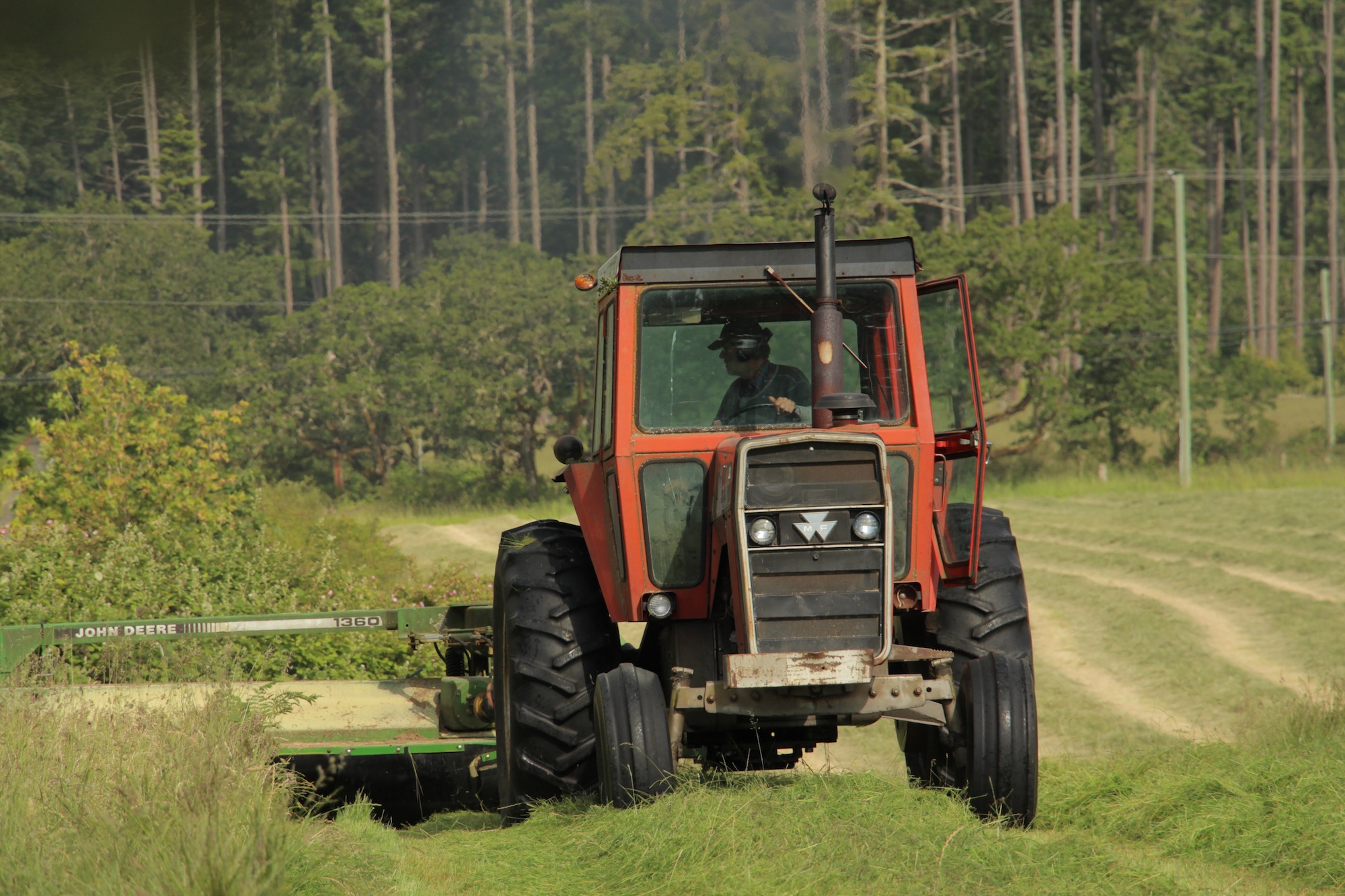 Most days this week at least a dozen tractors fly (relatively) down William Head road, riding in high gear, past Wind Whipped Farm, with their mowers, tedders (egg beater rakes) and bailers to and from the patchwork of hayfields that surround us. Local Food Box partners Parry Bay Sheep Farm and Stillmeadow Farm are amongst them. As pictured above, they are busy making lots of hay to sell and to store to feed sheep.