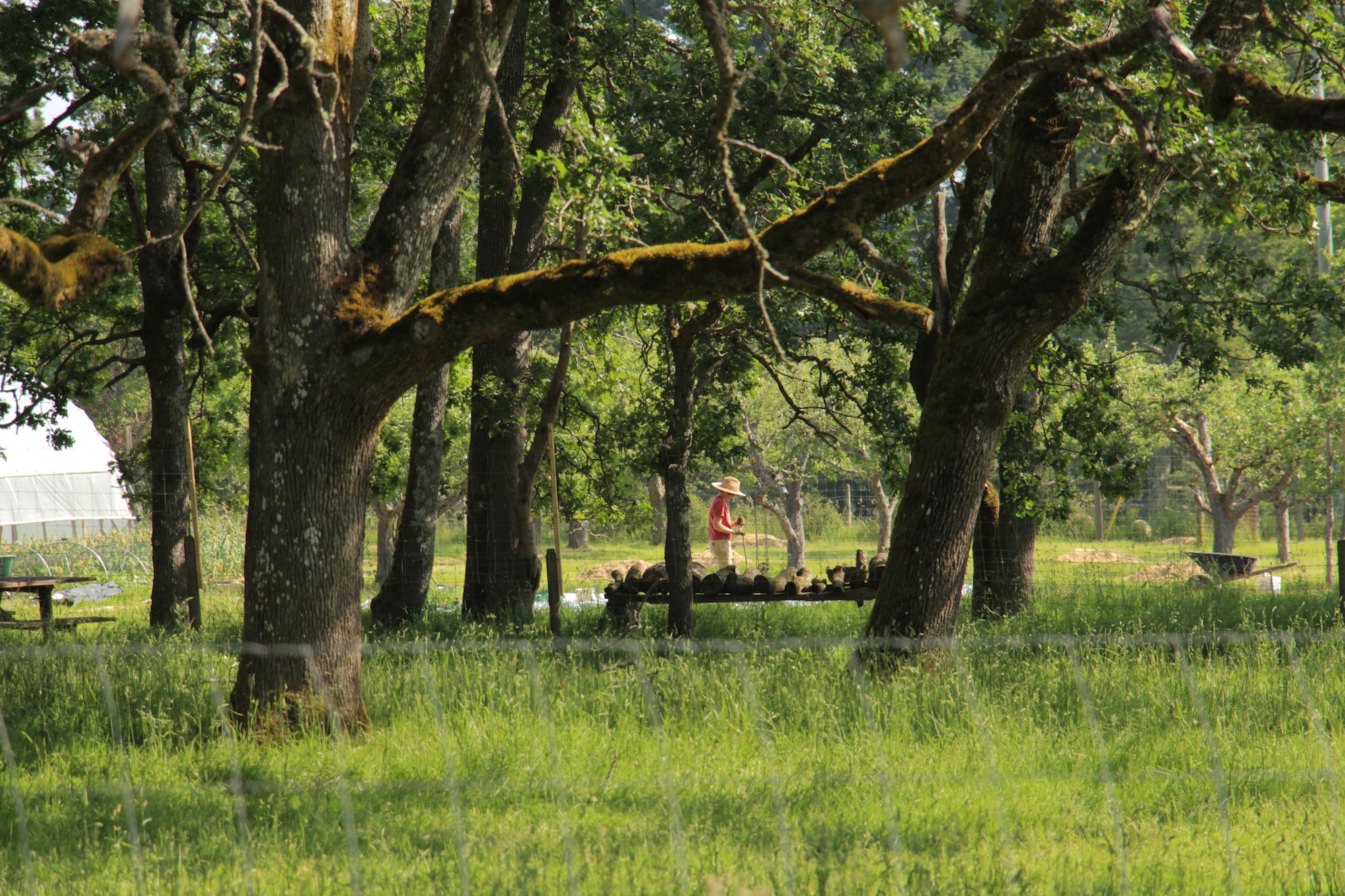 Between Wind Whipped Farm and the hay field is a patch of old Garry Oaks. Past the winding windrows and through the tall tress you can see the Wind Whipped Farm greenhouse…